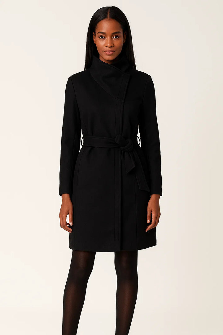 Slim A-line fit with tie belt, high wrap-over collar, mid-thigh length