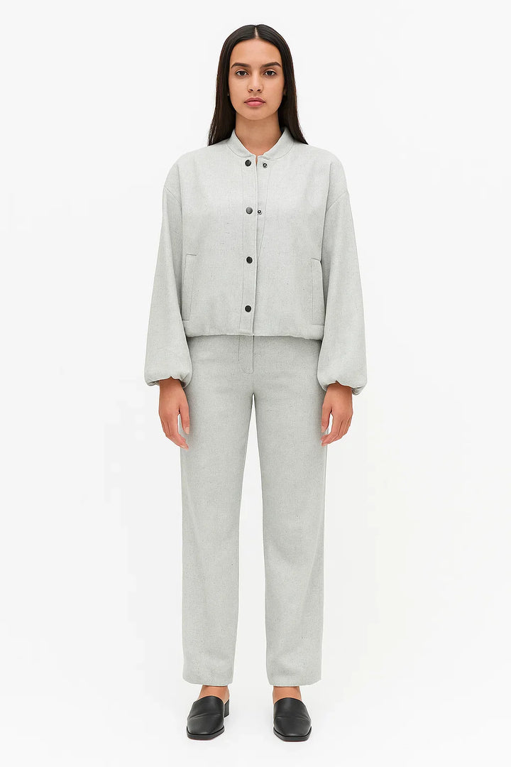A contemporary interpretation of the classic bomber, this jacket redefines simplicity with soft structure and ease. The stand collar and fluid balloon sleeves give it a refined yet relaxed character, perfect for layering across seasons. Its clean silhouette and smooth texture lend quiet confidence to any look, whether paired with tailoring or denim.