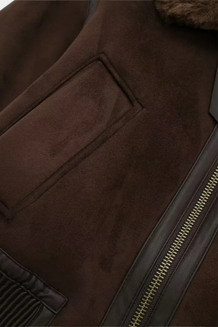 This MONTAVIEL aviator jacket captures the essence of winter luxury through texture and proportion. Crafted from soft faux shearling with a suede-effect finish, it delivers warmth and structure in equal measure. The cropped silhouette gives it a modern, confident line, balanced by ribbed cuffs and hem for definition.