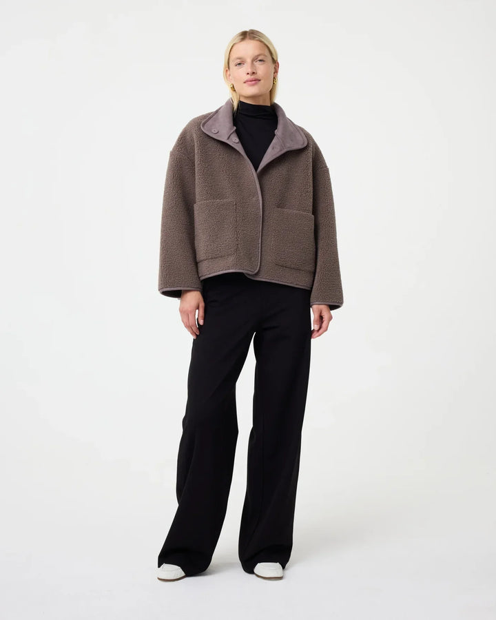 This soft faux shearling jacket delivers effortless warmth and contemporary simplicity. With its structured high collar and oversized shape, it balances comfort with clean architectural lines. The plush texture offers a tactile appeal, while the minimalist cut ensures a refined, modern aesthetic.