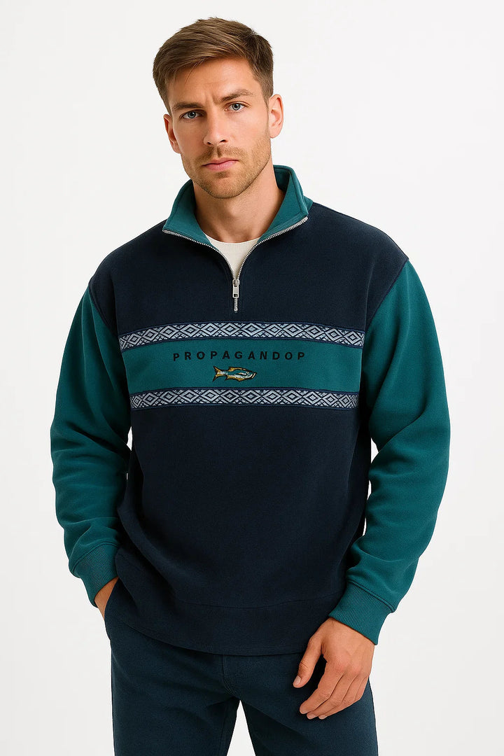 Drawing from vintage outdoor aesthetics, this MONTAVIEL half-zip pullover offers warmth with a touch of nostalgia. The two-tone colour palette and geometric chest band evoke a subtle heritage feel, while the brushed fleece texture delivers exceptional softness. Designed for relaxed weekends, autumn walks, and laid-back evenings, it combines function and understated style.