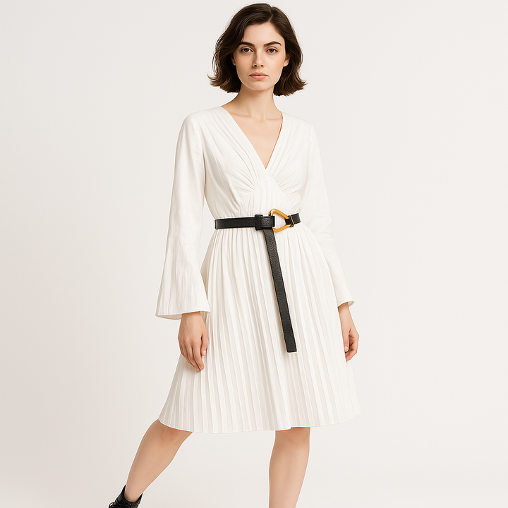 The Lina dress by MONTAVIEL embodies refined minimalism with a modern twist. Crafted from crisp white pleated fabric, it features a wrap-effect V-neckline and long flared sleeves that frame the silhouette with understated grace. The black belt with a sculptural gold buckle adds contrast and definition, creating a sophisticated yet versatile look — perfect for workdays, dinner dates, or city soirées.