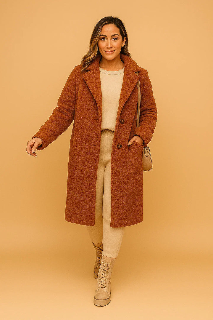 This long teddy coat offers enveloping warmth and quiet elegance in one effortless layer. Crafted from a plush wool-blend texture, it pairs a straight silhouette with a classic lapel collar for an elevated yet comforting winter look.