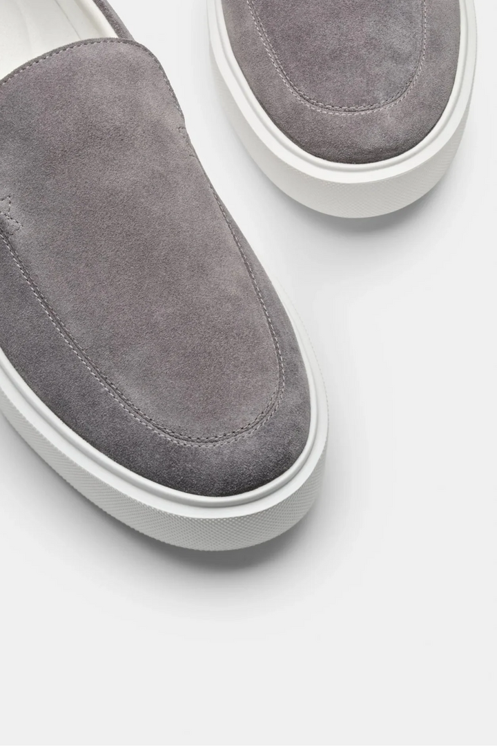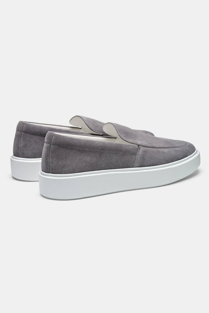 These grey suede loafers redefine everyday comfort with refined ease. The soft suede upper contrasts elegantly with a crisp white platform sole, creating a modern silhouette that works across casual and smart-casual looks. Designed for effortless wear, the slip-on style delivers understated sophistication with every step.
