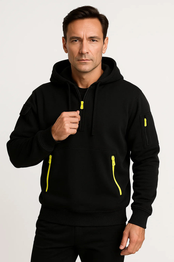 This MONTAVIEL hoodie combines modern utility with elevated casual style. Crafted from soft fleece-backed fabric, it offers warmth, structure, and effortless wearability. The design is refined with contrast zip details and an adjustable drawstring hood, balancing practicality and sophistication. Ideal for autumn through winter, it transitions seamlessly from relaxed weekends to polished casual settings.