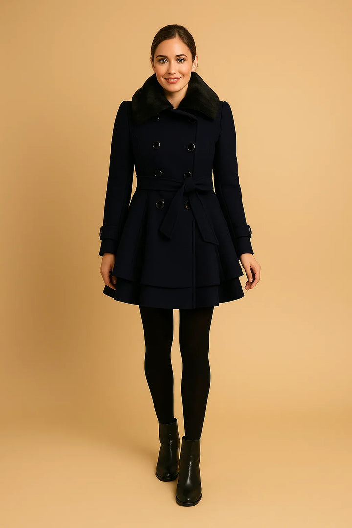 This A-line coat balances warmth and sculpted femininity with striking confidence. The double-breasted front and belted waist create a flattering silhouette, while the soft faux fur collar adds a touch of refined drama.