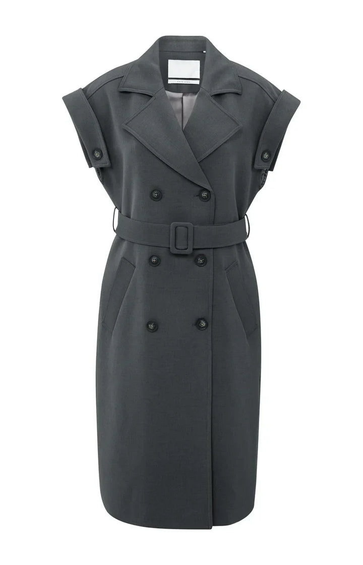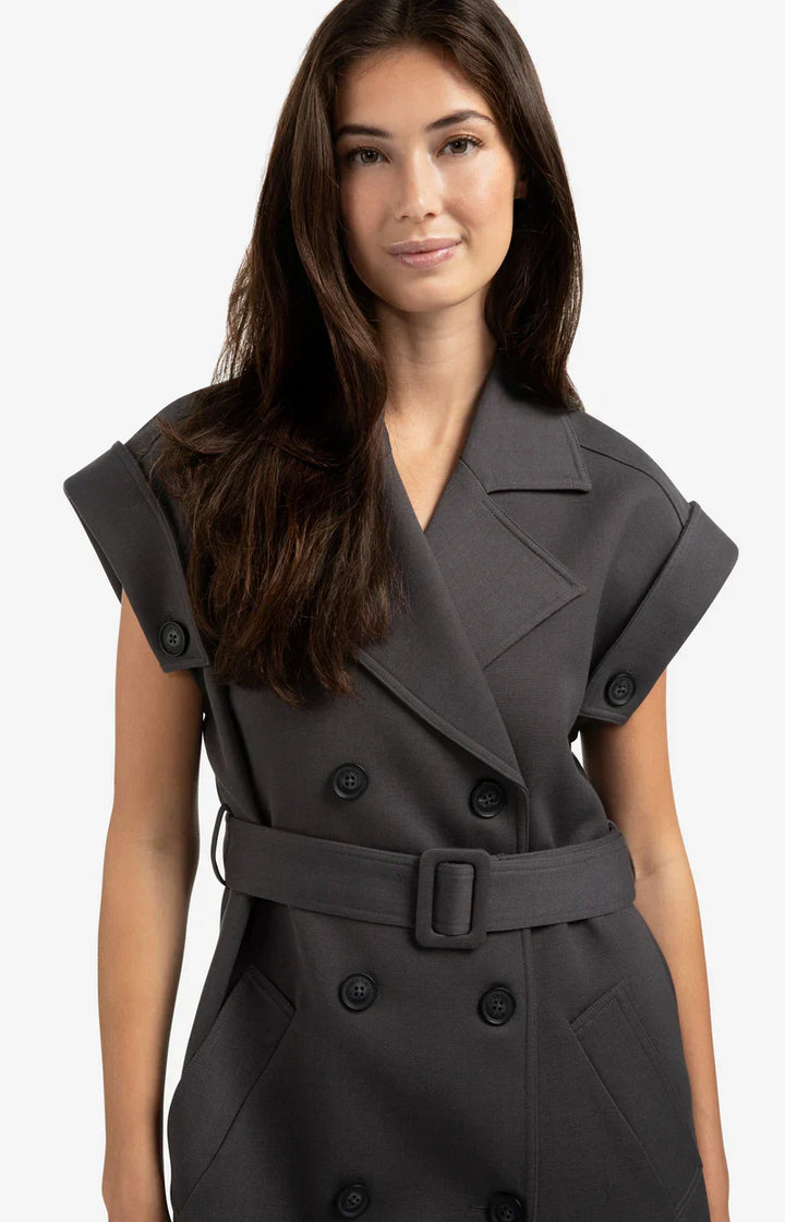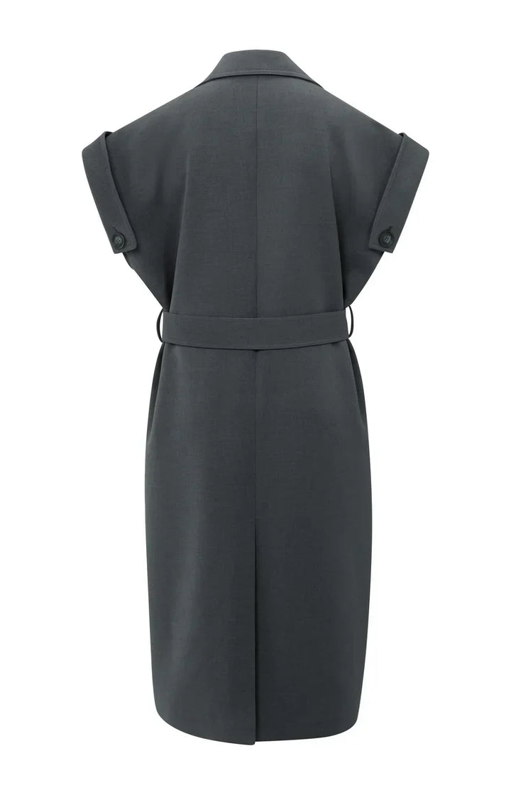 A refined fusion of structure and femininity, this sleeveless blazer dress brings confident ease to transitional dressing. Its sculpted silhouette, accentuated by a matching belt, balances tailored precision with soft modernity. The double-breasted front and notched lapels lend a polished edge that transitions effortlessly from day to evening.