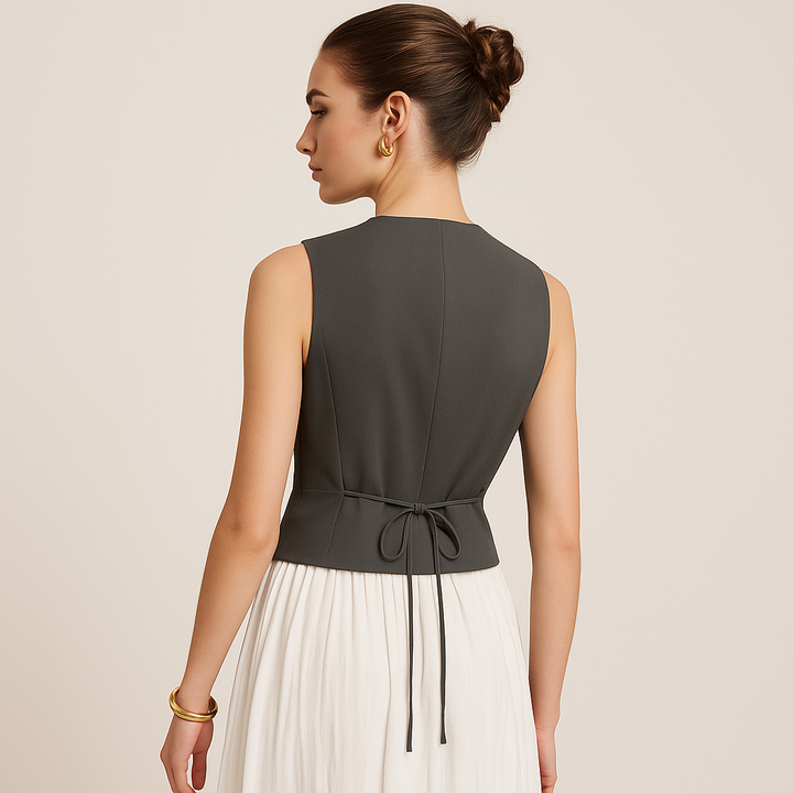 This sleeveless waistcoat combines architectural precision with understated elegance. Cut in a sculpting wrap silhouette, it fastens at the waist with a polished gold-tone ring that draws the eye to the natural curve of the body.
