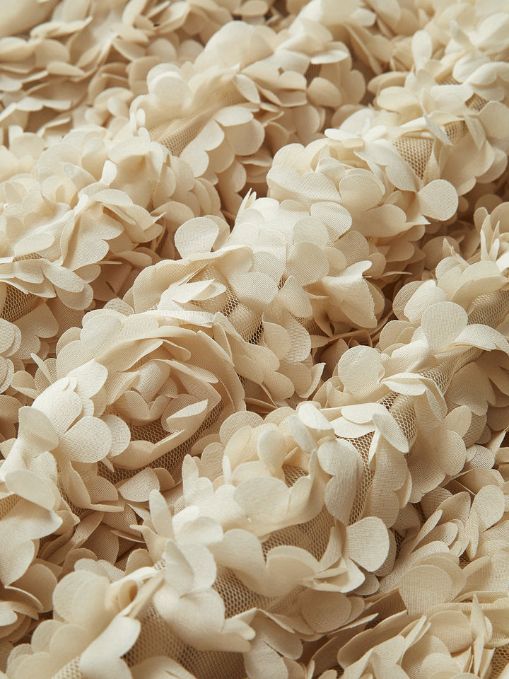 A sculptural layer that commands attention. This short jacket is defined by its intricate 3D floral texture, creating depth and movement with every detail. The open front and rounded neckline lend a soft silhouette, making it ideal for both day and evening wear.